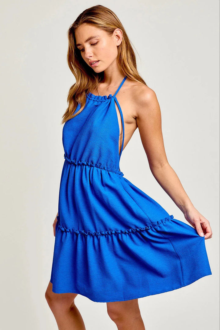 Upgrade your wardrobe with our Halter Neck Open Back Flare Mini Dress. Its halter neck and open back design will make you stand out in any crowd. Its flared skirt will give you a flattering and feminine silhouette. Perfect for any occasion. Add this dress to your collection today!